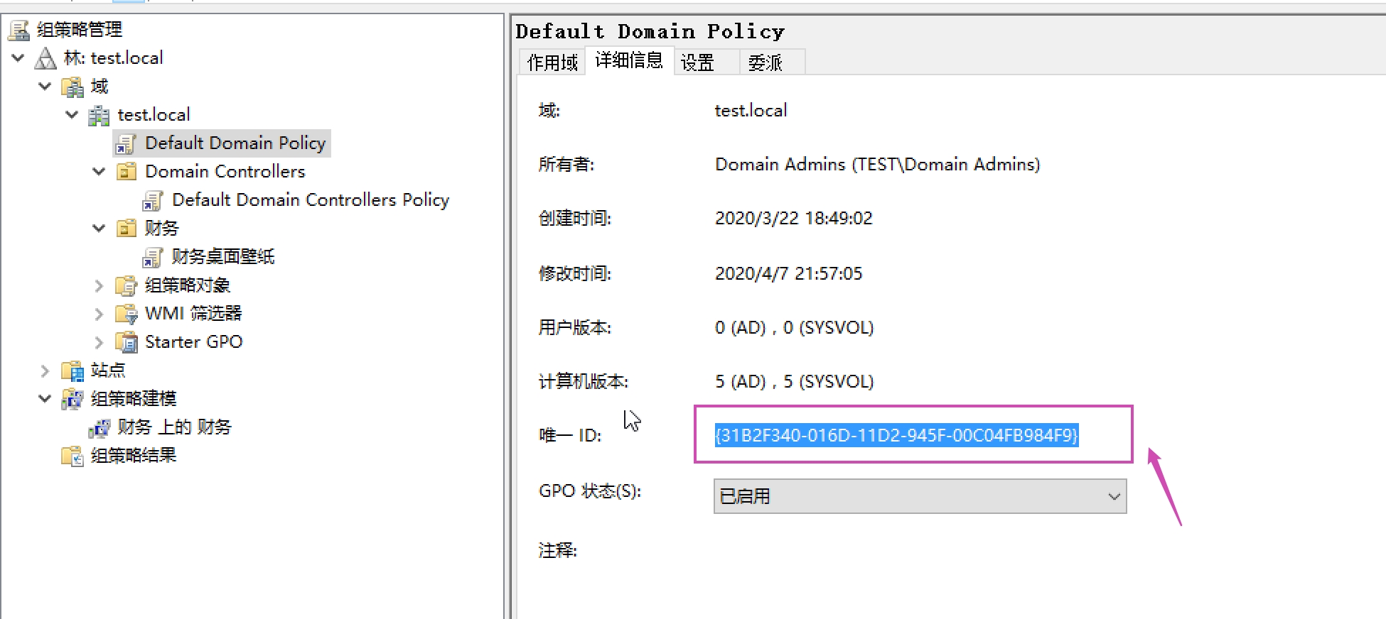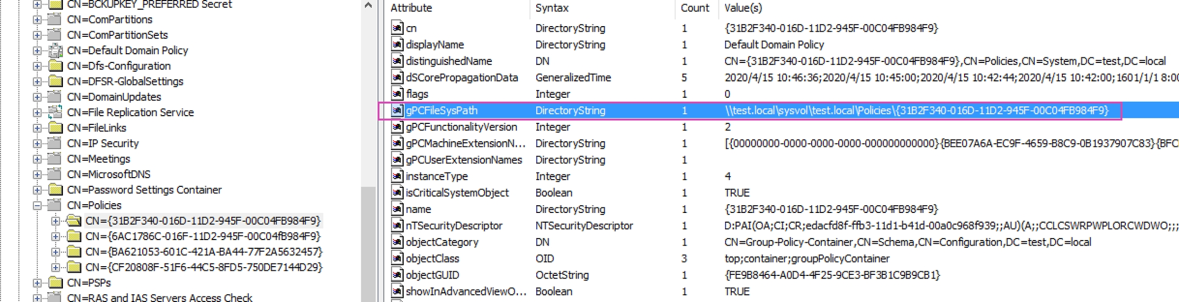 以Default Domain Policy为例。他对应的GPC是CN={31B2F340-016D-11D2-945F-00C04FB984F9},CN=Policies,CN=System,DC=test,DC=local,displayName是Default Domain Policy。