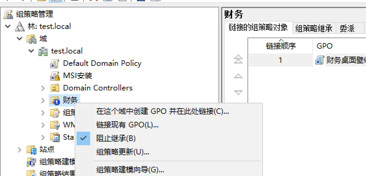 举个例子,财务这个OU位于test.local 这个域内, Default Domain Policy 这条组策略链接到 test.local 这个域,所以默认情况底下,OU 会继承,这条组策略也同时会作用于财务这个OU,如果我在财务这边选择组织继承,就不会作用域财务这个OU,在LDAP上下的体现就是财务这个OU的属性