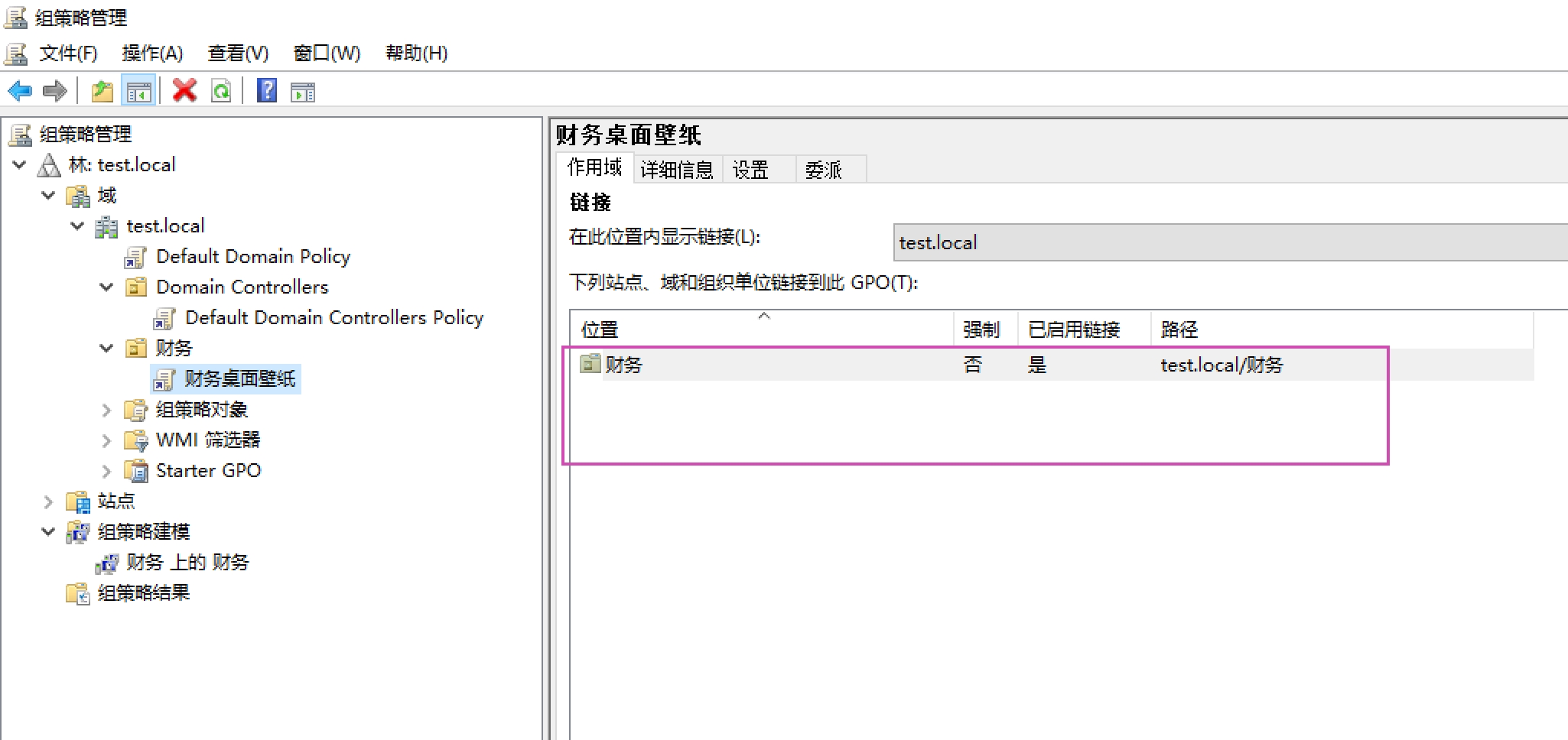 在右边的作用域里面,我们可以看到他链接到test.local整个域,也就是说在test.local域内的所有计算机,用户都会受到这条组策略的影响。链接的位置可以是站点,域,以及OU(特别注意,这里没有组,只有OU,至于为啥,可以返回去看组和OU的区别)。又比如说财务桌面壁纸这条组策略。他就链接到财务这个OU。