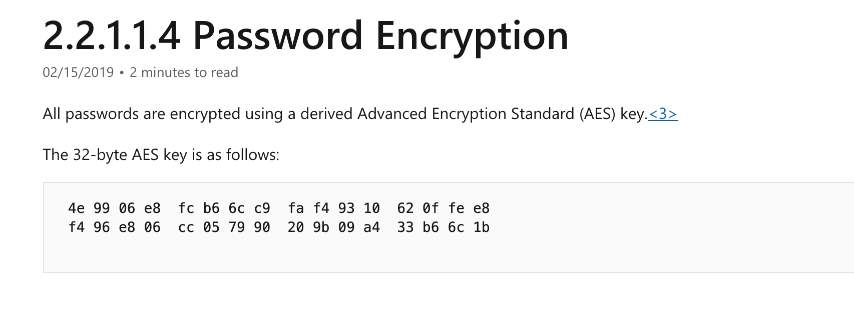 在早期的版本,某些组策略首选项可以存储加密过的密码,加密方式为AES 256,虽然目前AES 256很难被攻破,但是微软选择公开了私钥:)。