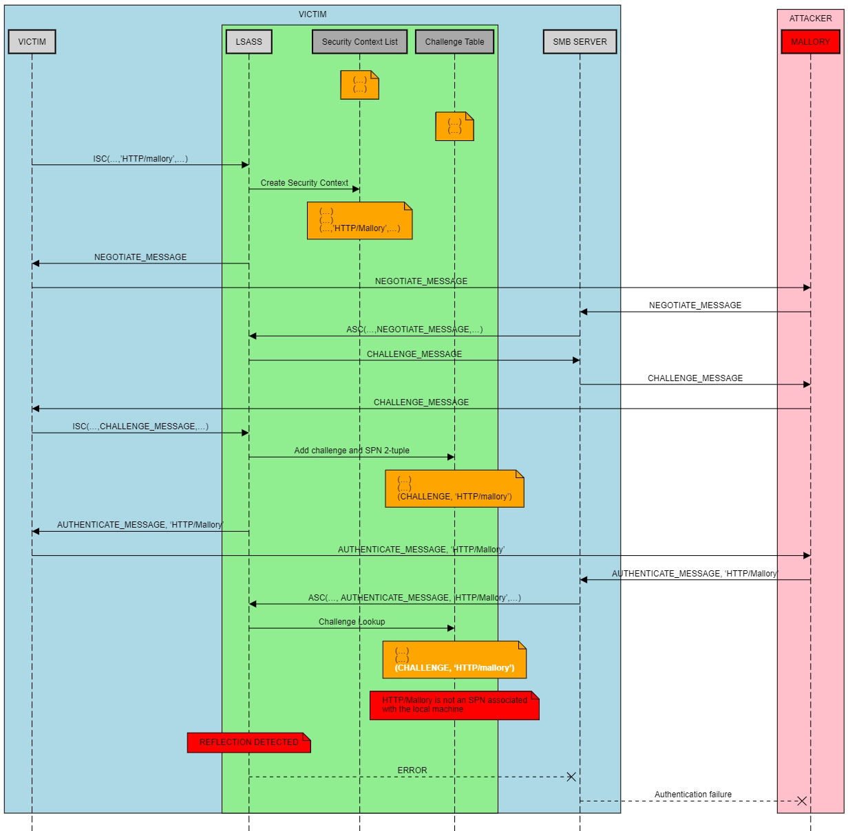 在这之前,当拿到用户的smb请求之后,最直接的就是把请求Relay回用户本身,即Reflect。从而控制机子本身。漏洞危害特别高。微软在kb957097补丁里面通过修改SMB身份验证答复的验证方式来防止凭据重播,从而解决了该漏洞。防止凭据重播的做法如下: