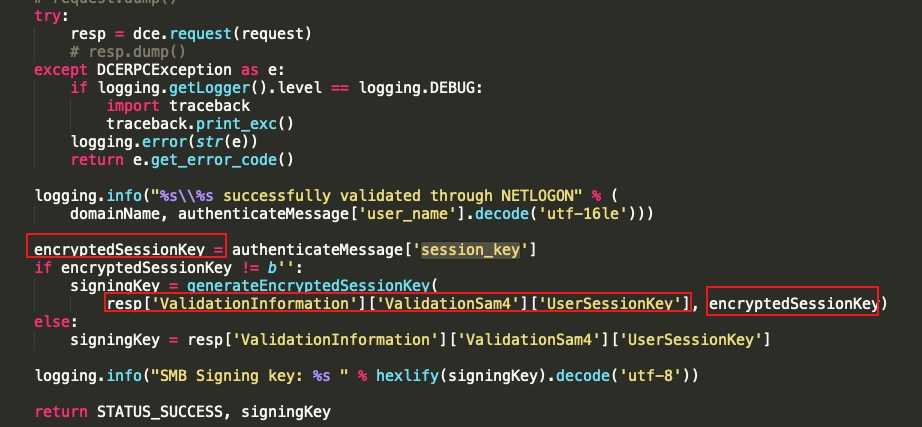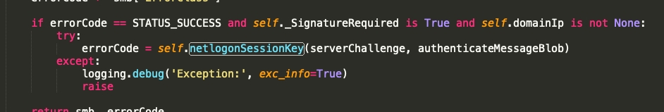 之前的文章说过,在域内进行NTLM_RELAY的时候,如果登录的用户是域用户,这个时候认证服务器本地是没有域用户的hash的,这个时候会通过NETLOGON把type 1,type 2,type 3全部发给域控,让域控去判断。并不是向域控索要域用户的hash。那在认证之后,由于没有用户的hash,也没有办法算出key_exchange_key,这个时候认证服务器就会通过NETLOGON去找域控索要key_exchange_key。从而算出exported_session_key。