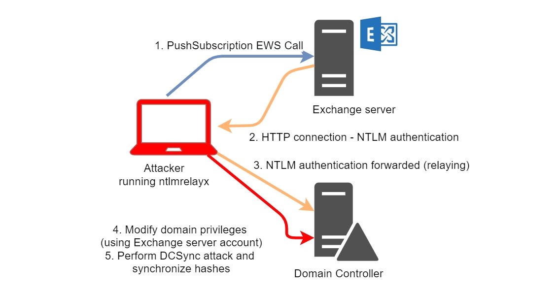 Exchange允许任何用户为推送订阅指定所需的URL,服务器将尝试向这个URL发送通知。问题出在Exchange服务器使用CredentialCache.DefaultCredentials进行连接。传进的URL我们可控,也就说我们可以控制Exchange服务器向我们发起HTTP 协议的NTLM 请求。我们就能拿到Exchange机器用户的 Net-Ntlm Hash。如图中的步骤1,步骤2所示。